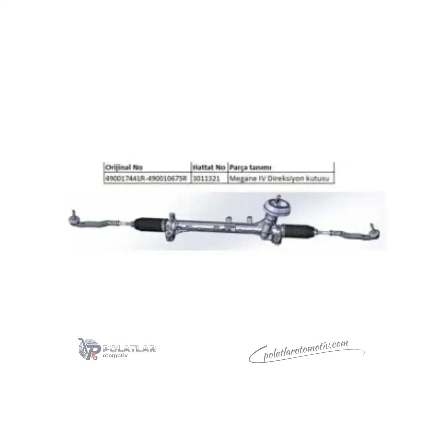 490017441R Direksiyon Kutusu (3011321H) HTT A010U962HT Yedek Parça Bilgisi 490017441R OEM numaralı Direksiyon Kutusu (3011321H) yedek parçamız, HATTAT marka olup, 2015 ve Sonrası Megane IV modelleriyle uyumlu BM motor tipine sahip araçlarda kullanıma uygundur. Bu Direksiyon Kutusu ürünü, HATTAT markası güvencesiyle orijinal kalitede üretilmiş olup, uzun ömürlü kullanım ve yüksek performans sunar. Teknik Bilgiler Ürün Adı: Direksiyon Kutusu